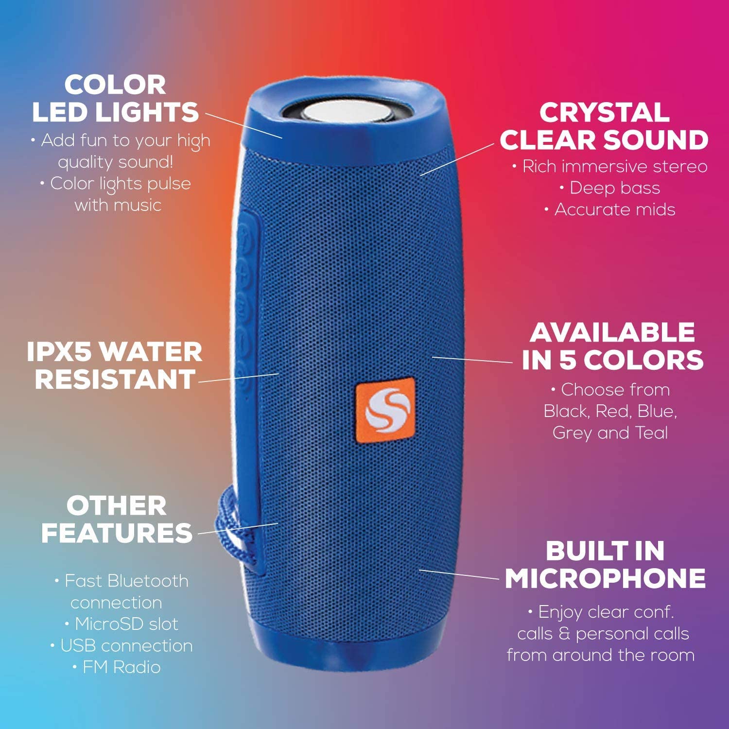 Description: SilverOnyx portable Bluetooth speaker provides powerful, crystal clear stereo sound, deep bass, and accurate mids and highs. This compact, Ipx5 waterproof speaker is powered by a long lasting rechargeable Li ion battery, so you can have music with you all day, wherever life takes you. Light show: lighting can pulse to your music and add some color to your environment. Built in microphone allows you to easily take personal and conference calls with clear quality. Ipx5 Water Resistant technology makes is perfect for the beach, pool, shower or anywhere else you go. Can resist indirect water spray and splash, but cannot be submerged. Bluetooth 4.2 technology provides longer range, higher quality and faster connection. Features: Bluetooth 4.2 Led Lights Ipx5 Water Resistant Microphone MicroSd 3.5mm Aux In Usb Radio Specifications: Range: 33 feet Battery: 3.7V 1200mAh Speaker Driver: 57mm x 2 Frequency: 120Hz to 20Khz Unit Size: 72.6 x 72.9 x 178.7mm Unit Weight: 490g What’s in the Box: 1 x SilverOnyx 157 Speaker 1 x 3.5mm Aux Line In Cable.