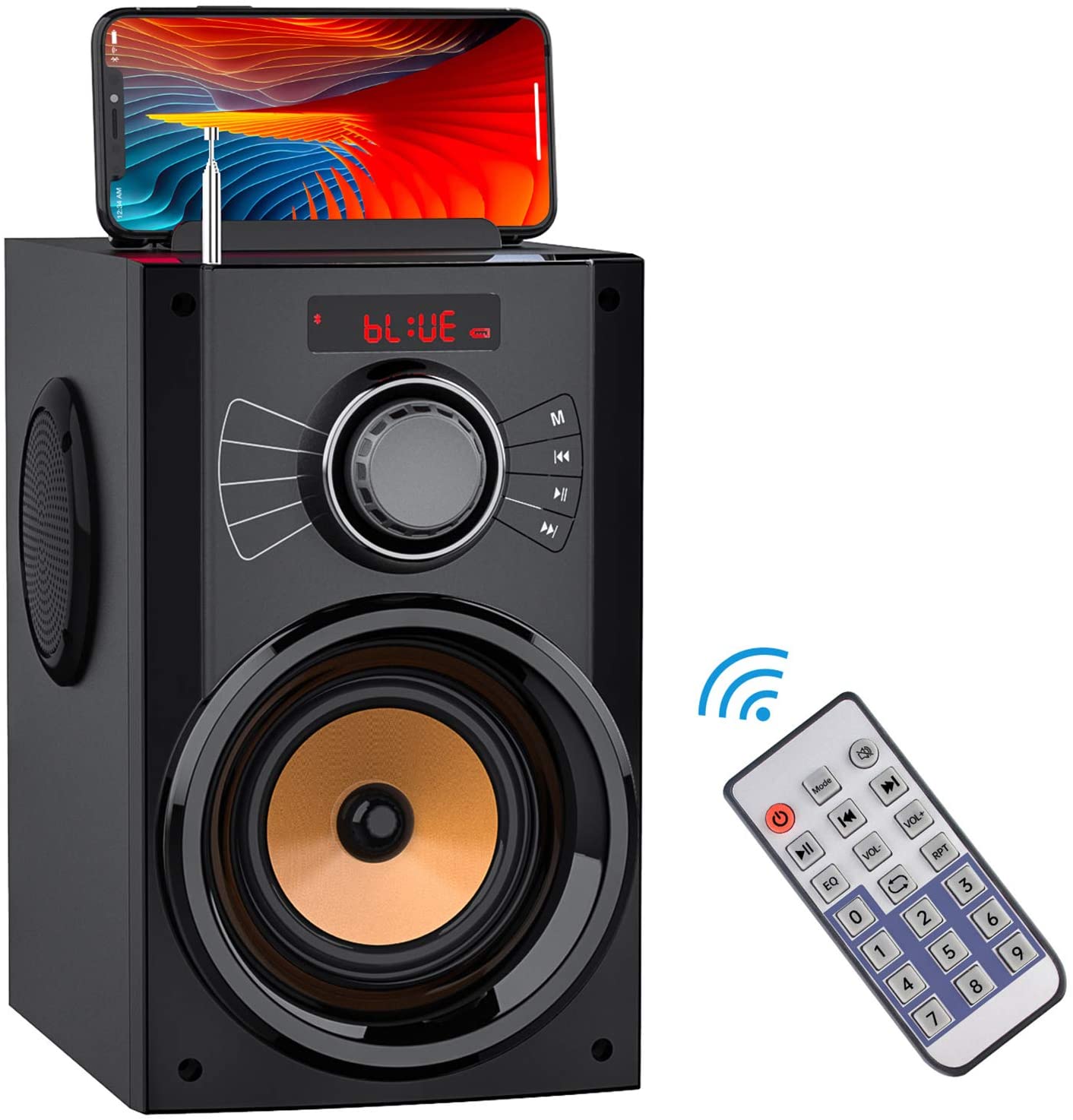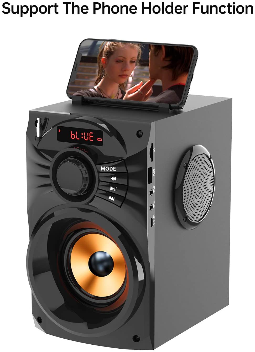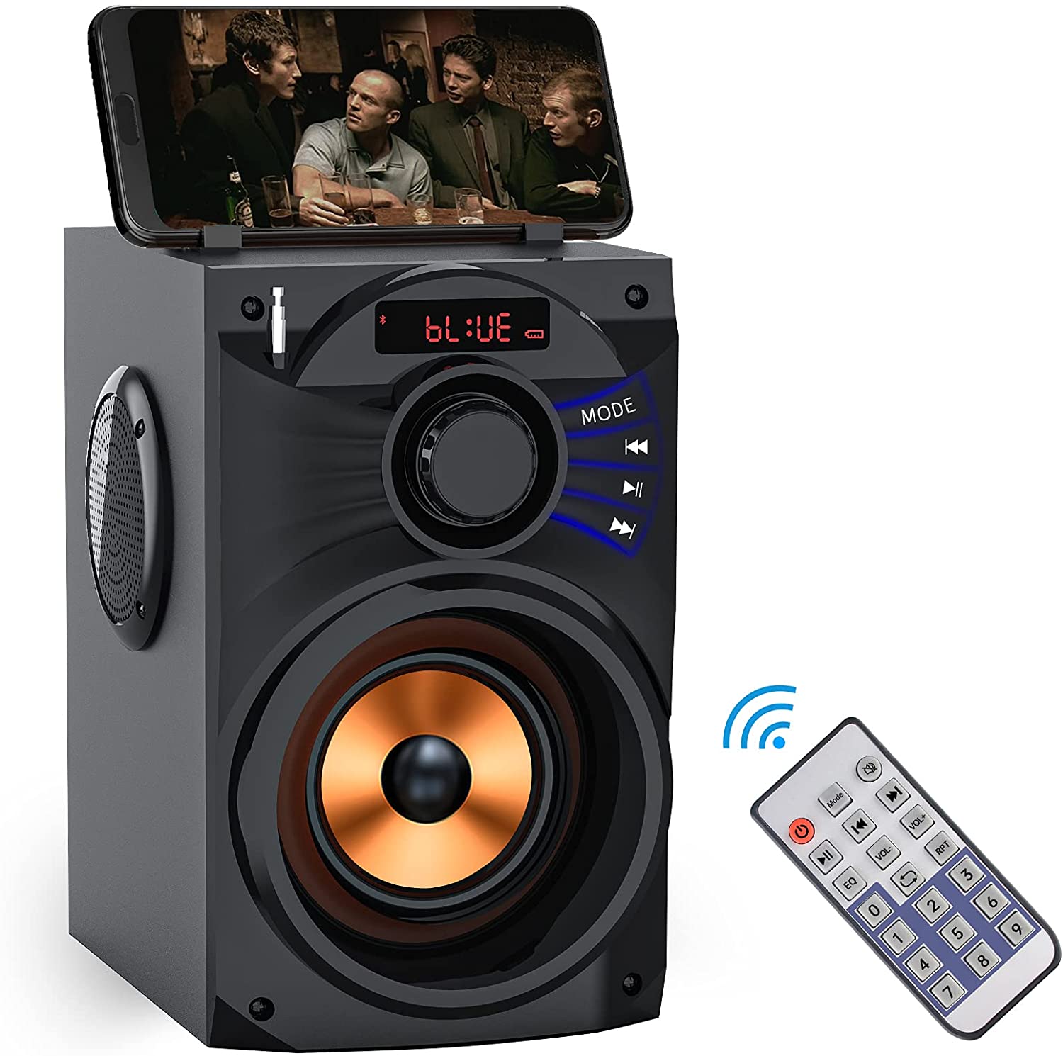 22. A This speaker is a great buy! Bluetooth speaker, built-in Bluetooth 4.2 wireless transmission, working distance up to 10 metersпјЊIt is lightweight, making it very portable. The sound is clear and louder than you would expect. It has a place for the remote on top and also acts as a kick stand for your phone. You can connect different devices too.